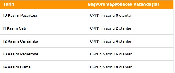 Başvuru sürecinde yoğunluk yaşanmaması amacıyla, TC kimlik numarasının (TCKN) son hanesine göre başvuru günleri belirlendi. Başvuru sistemi 15 Kasım itibarıyla tüm vatandaşlara açılacak ve 19 Aralık 2025 tarihine kadar devam edecek.