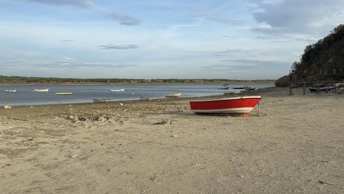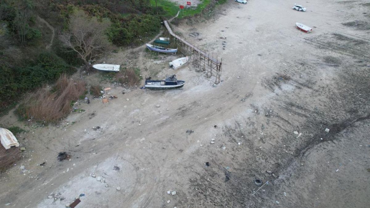 Görüntülerde, karaya oturan tekneler, toprak üzerinde kalan iskele ve suyun kıyıdan metrelerce uzaklaştığı net şekilde görüldü.