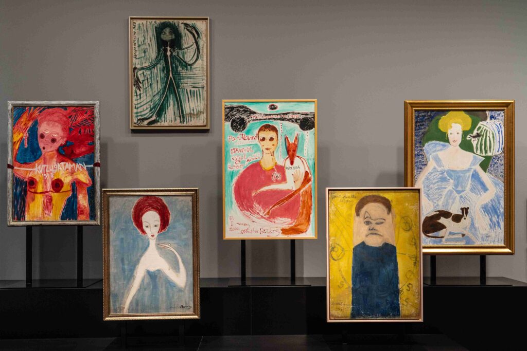 Bu merkezden uzandıkça sergi, bir biyografi anlatımından ziyade bir yaşamın katmanlarını açığa çıkarıyor. Otoportreler, portreler ve anne figürü etrafında şekillenen eserler; Berksoy’un kişisel hafızası ve kolektif tarihin bir kesişme noktası oluşturuyor. Çocuk yaşta annesini kaybetmesi, sahne ile olan derin bağı, bedenin hem bir temsil hem hafıza taşıyıcısı hâline gelmesi, resimlerde simgesel imgelerle yakalanıyor. Bazen bir mezar, bazen bir bebek ya da mavi bir “kader çizgisi” olarak betimlenen bu imgeler, yaşam, ölüm ve yeniden doğuş temalarının sürekli olarak tekrarıyla dikkat çekiyor.