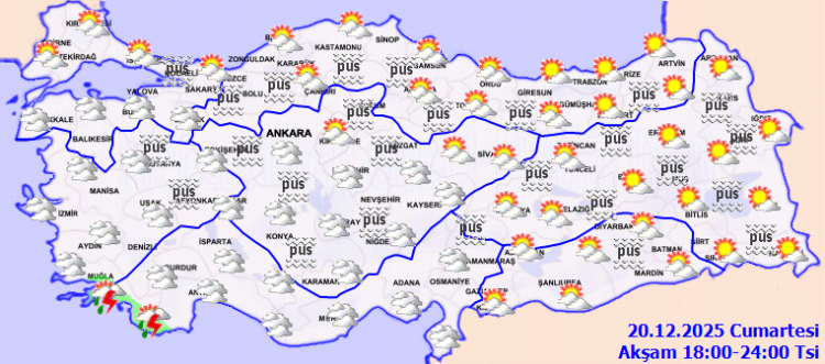 ANKARA (İGFA) – Meteoroloji Genel Müdürlüğü, 20 Aralık Cumartesi gününe ilişkin hava tahmin raporunu yayımladı.